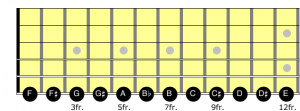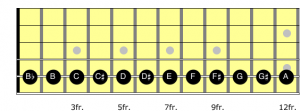 In order to identify barre chords in ex. 1 we need to learn the notes on the 6th string. The 6th string (big string) is the root note that identifies the chord.