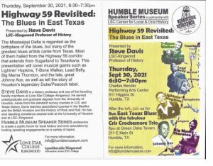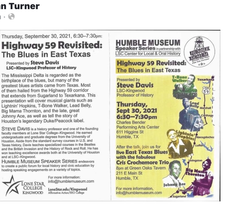 On Thursday, September 30, Professor Steve Davis will be presenting Highway 59 Revisited The Blues In East Texas at The Charles Bender Performing Arts Center in Humble. I have taken history classes and heard him speak about local music. He is wonderful. I encourage all my friends to be there.
